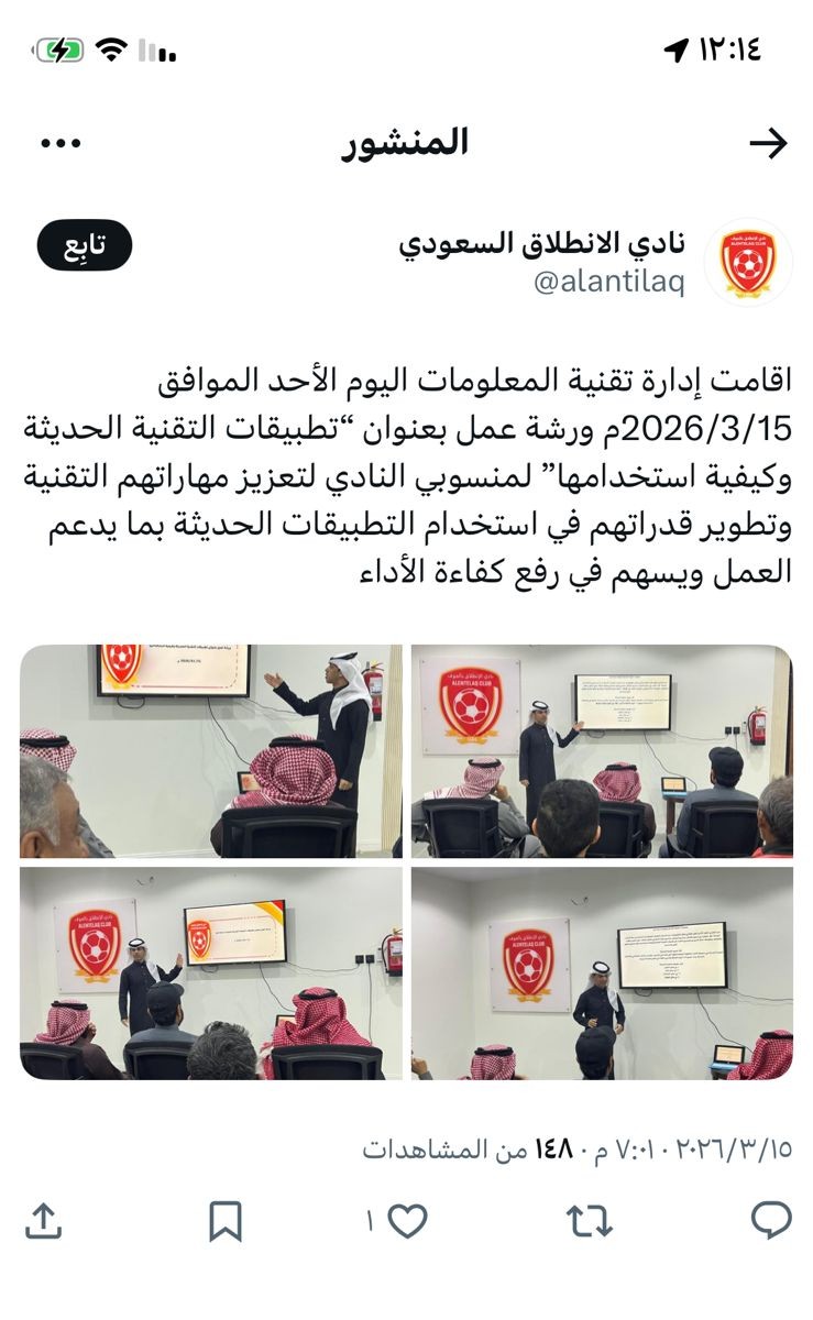اقامت إدارة تقنية المعلومات ورشة عمل بعنوان ( تطبيقات التقنية الحديثة وكيفية استخدامها ) لمنسوبي النادي لتعزيز مهاراتهم التقنية