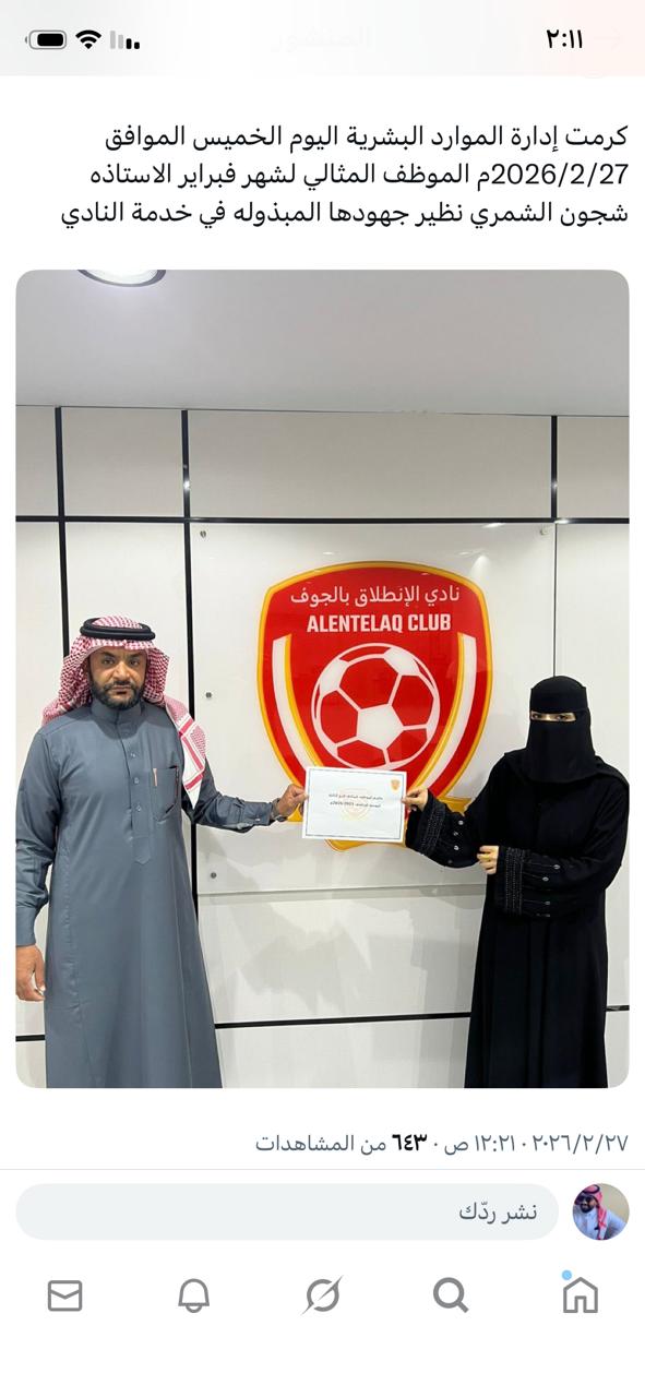 مشاهدة المزيدكرمت إدارة النادي الموظف المثالث الاستاذة شجون الشمري عن شهر فبراير لعام 2026
